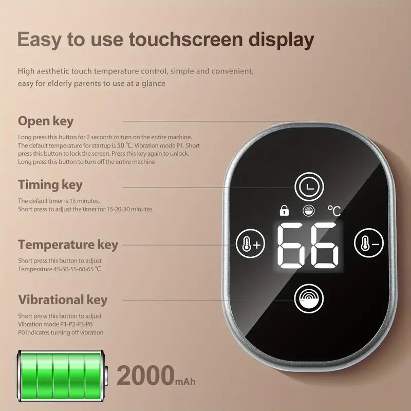 This knee massage pad is user-friendly; simply hold the button for three seconds to begin or stop its operation. Secure the device at the knee, elbow, or shoulder area. Next, hit the temperature button to activate the heating feature, and press it once more to modify the temperature. To enable the vibration function, press the vibration button, and press again to change the intensity of the vibrations.