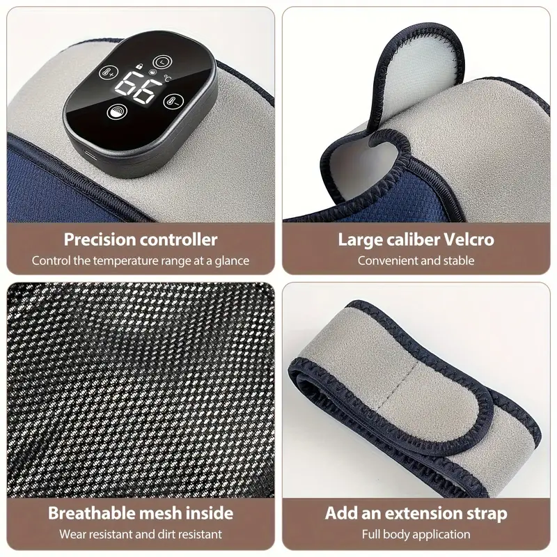 The 3-in-1 heating massager wrap pad is designed for use on knees, elbows, and shoulders. It includes an extension strap that secures the knee massager while also making it suitable for arms, thighs, calves, and ankles.
