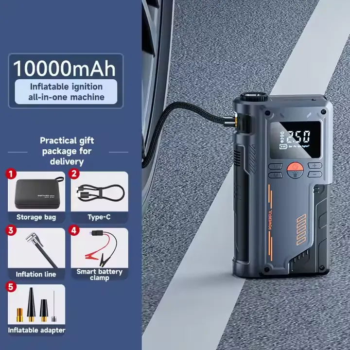 - In addition to jump-starting and tire inflation, this device may include additional features such as a built-in flashlight for nighttime emergencies, USB ports for charging mobile devices, and safety features to prevent overcharging and short-circuiting.